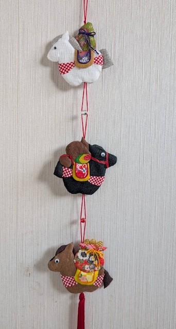馬3連 ひょうたん、打ちでの小槌、巾着袋を背負っている