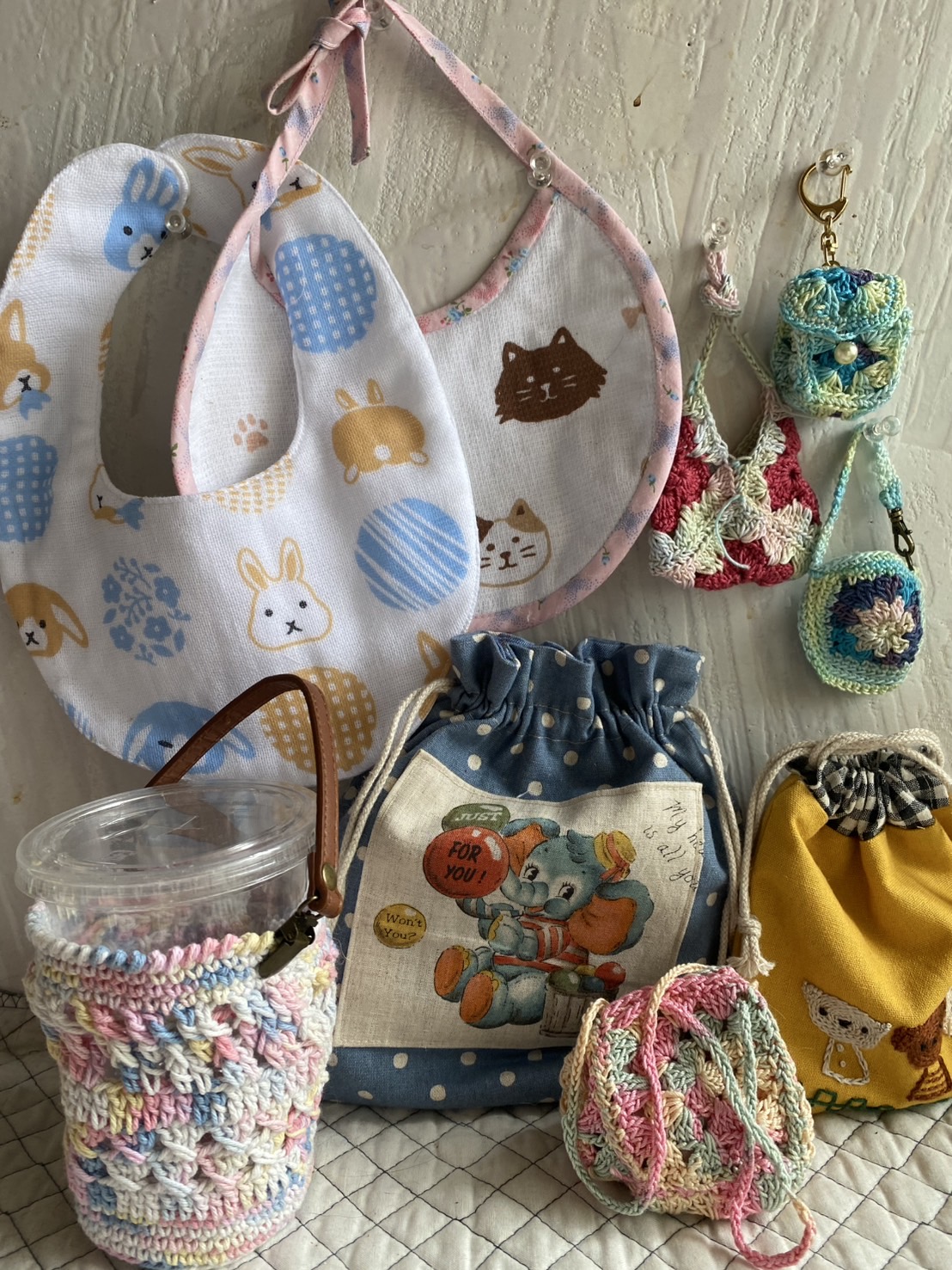 内容:布地と編物で作ったかわいい小物と雑貨。美味しいパウンドケーキも有るよ♪