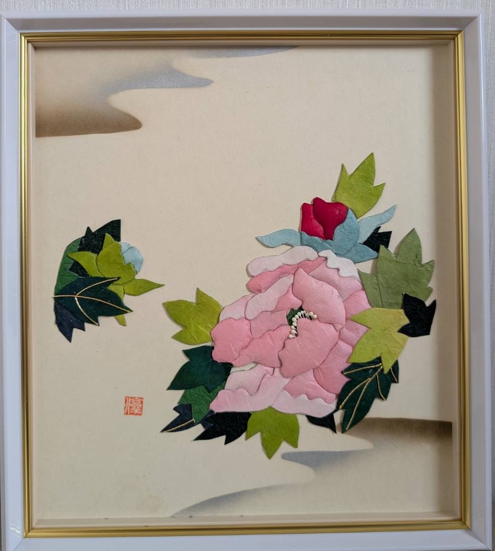 豪華な花の中にも、楚々をした味わいの作品です。季節を問わずお家に飾って頂きたい絵柄です。